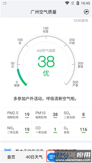该软件可提供未来四十天的天气趋势参考,同时推送所在地的空气质量信息,例如细颗粒物、二氧化硫、一氧化碳等指标,并给出是否适宜运动或外出等具体建议。