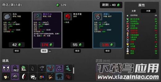 总共20波敌人,每波持续时间从20秒逐步增至90秒,结束后开启商店,可购买道具武器或消耗材料刷新。