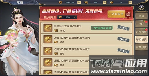 此项投资的回报十分丰厚,可获取十倍绑定元宝返还;绑定元宝在游戏中用途广泛,用于购买副本次数、进入专属地图、复活、任务找回及商城购物等;该投资计划在服务器开启期间仅有一次,值得把握。