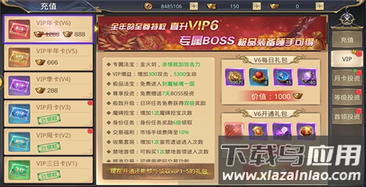 游戏前期最具性价比的元宝消耗方式之一是购买VIP特权;其中直接获取VIP6的优惠最为突出,原价1288元宝,初期仅需888元宝;开通后可享有副本次数增加、经验加成、额外镶嵌孔、专属法宝与首领挑战等多项权益,对计划长期游玩的玩家而言价值显著。