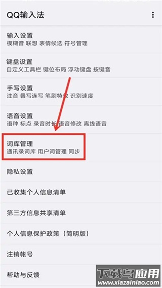2、在设置菜单中找到并点击“词库管理”选项;