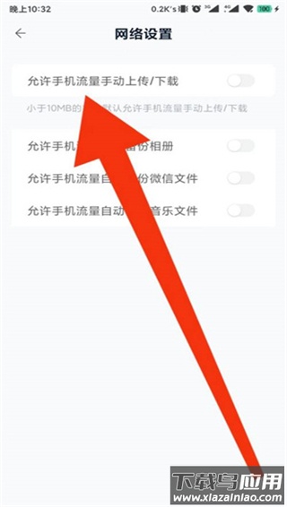 3、在网络设置界面找到“允许手机流量手动上传/下载”开关,开启后,小于10MB的文件将默认允许使用移动网络进行手动传输。