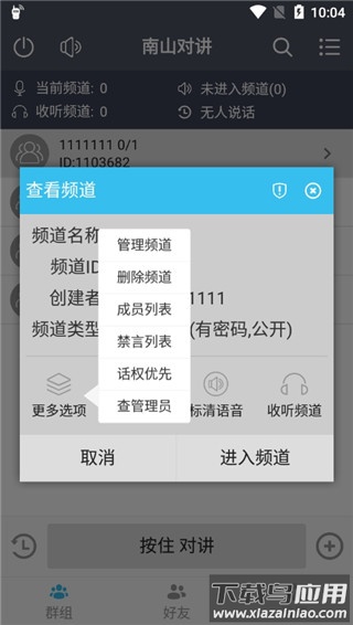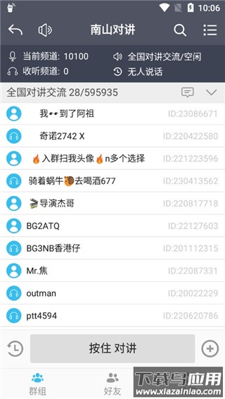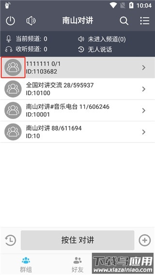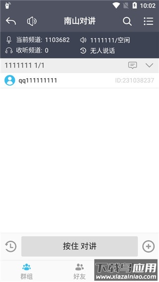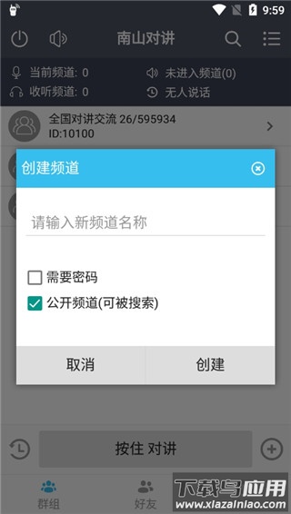 3、频道创建后,他人可通过搜索功能加入,点击下方按住对讲即可开始交流;