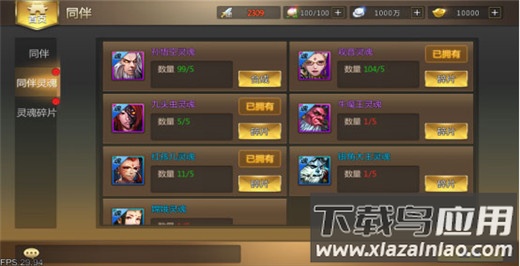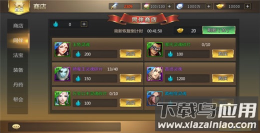 最多可同时上阵两名同伴。同伴按品质分为紫色、蓝色、绿色三种,其成长体系与主角相似,均具备装备、法宝、技能及养成功能。同伴可通过灵魂合成获得,灵魂又由碎片合成,相关操作均在同伴界面完成。这些材料主要通过抽奖与同伴商店获取;抽奖有几率直接获得完整同伴卡,若已拥有该同伴,则会转化为5个对应灵魂。在同伴商店中,可使用神魂兑换灵魂或灵魂碎片。