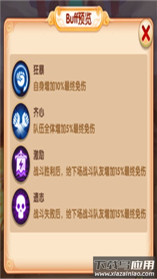 激励:战斗胜利后,为下一场队友提升15%最终免伤;