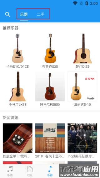 乐器板块介绍了多种相关乐器信息,同时设有二手交易区,用户可以在此了解或参与吉他的转让与求购。