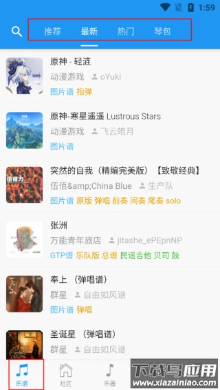 乐谱板块提供了大量吉他谱资源供用户学习;你可以通过推荐、最新发布、热门排行或自定义琴包等方式查找需要的曲谱。