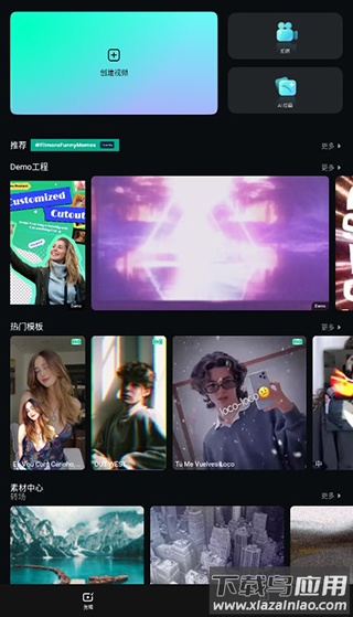 用户进入软件之后就会到首页,在首页可以使用创建视频、素材中心、Demo工程、素材中心、音乐等功能。