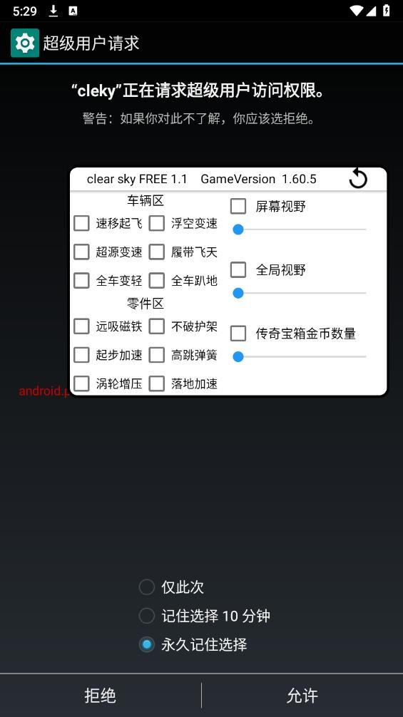1、获取并安装软件后,启动修改器,同时授予其所需的ROOT权限。