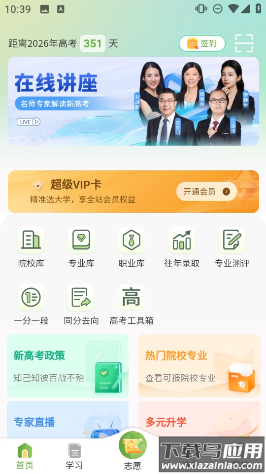 2、在首页可查看在线讲座、院校库、专业库等板块,也能获取新高考政策与热门院校专业资讯,辅助升学规划;