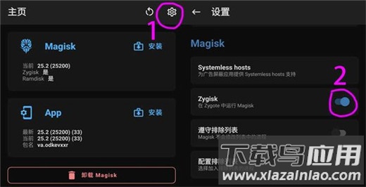 2、打开Magisk管理器,进入设置界面,开启Zygisk选项;