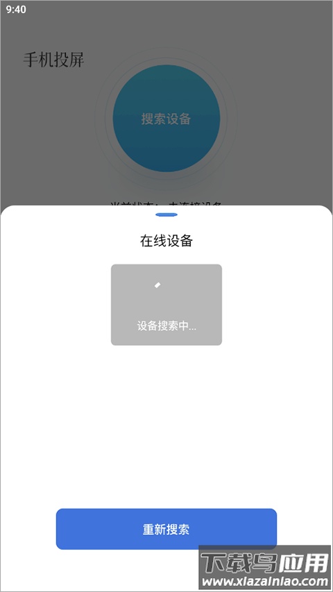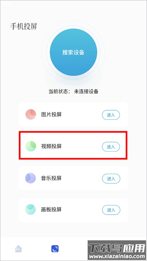 4、切换到手机投屏页面,点击搜索设备;需要确保手机与投屏设备连接同一WiFi;