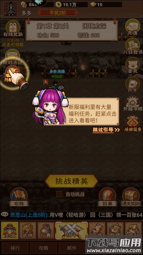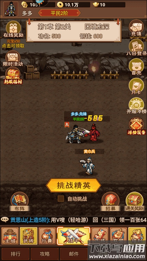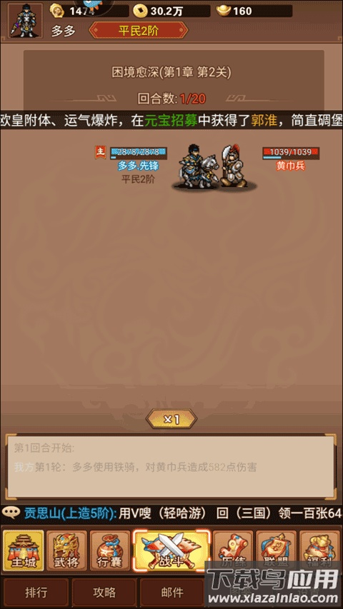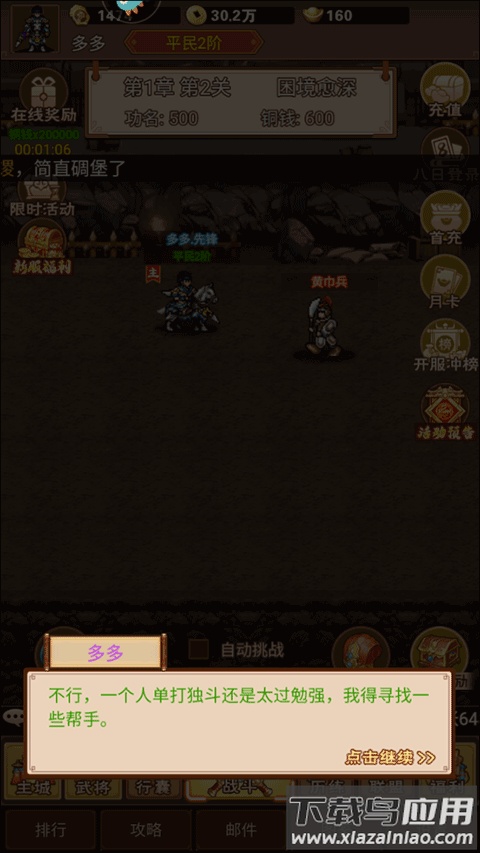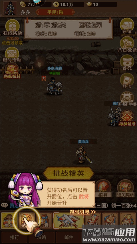 游戏玩法直观易上手,核心在于培养武将伙伴。玩家需要招募更高品质的武将来壮大队伍,同时为武将配备强力装备以提升整体战力。唯有不断强化自身,才能在这纷乱世道中开创属于你的传奇征程。