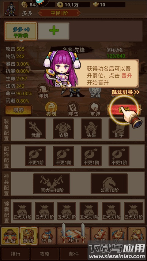 2、在武将页面中选择“晋升”,完成武将等级提升;