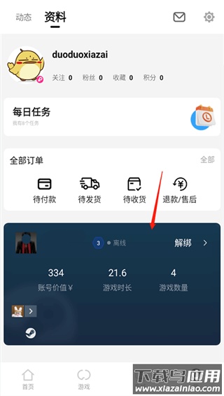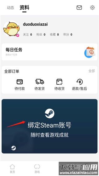 4、登录成功后返回“我的”界面,即可看到Steam账号已绑定