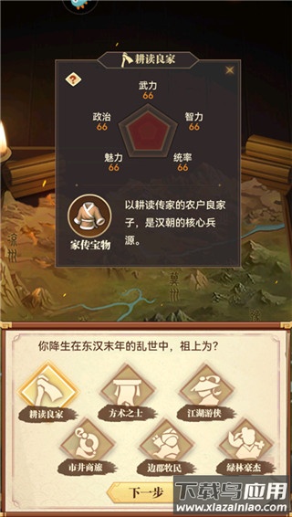 2、跳过开场剧情后,选择出身背景,不同出身提供各异的基础属性;