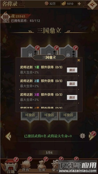 2、名将录:获得新武将可激活图鉴,提升全体属性;组合内的武将升星后,还能激活额外的全体属性增益(小技巧:铜币充裕时,可升级升星武将激活所需属性,随后下野返还经验,星级会保留)。