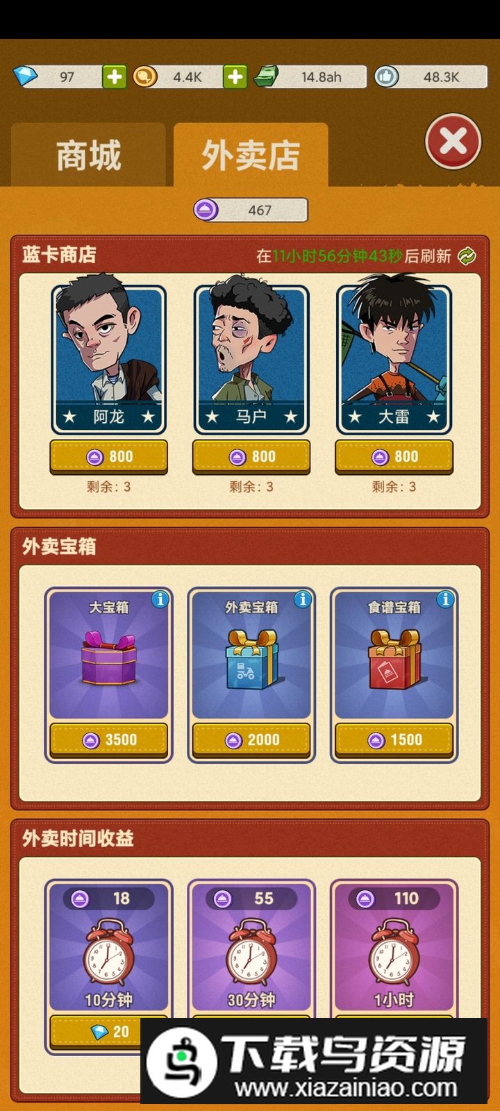 人物卡片等级至关重要,获取宝箱有两种主要货币:钻石与外卖币。外卖币更易获得,因此应优先兑换外卖小哥与食谱卡片。
