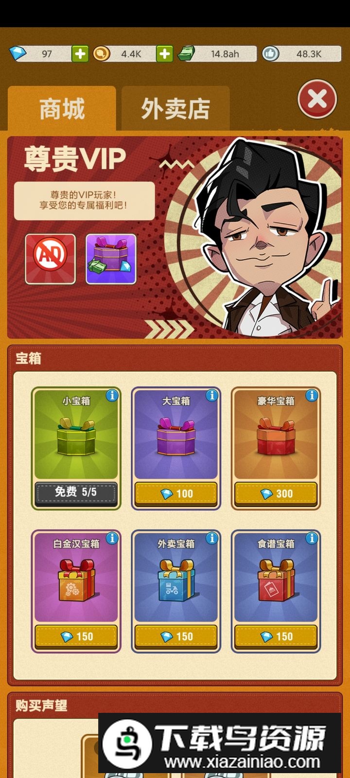 每日还有五个免费小宝箱,订单刷新十个贵宾奖励小宝箱,金钱与外卖币双倍奖励每八小时可通过广告各获得三次大宝箱与食谱宝箱。