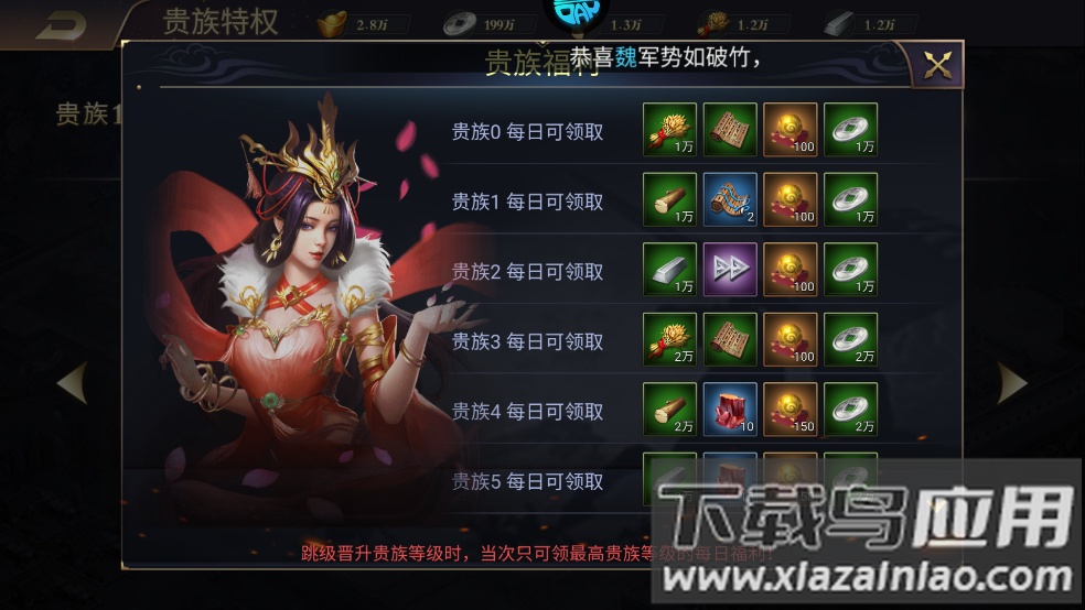 1、每日均可领取专属的贵族福利,记得及时上线获取。