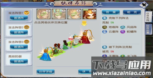 玩家可为伙伴设置攻击或防御类阵法,并根据不同战斗需求灵活切换。