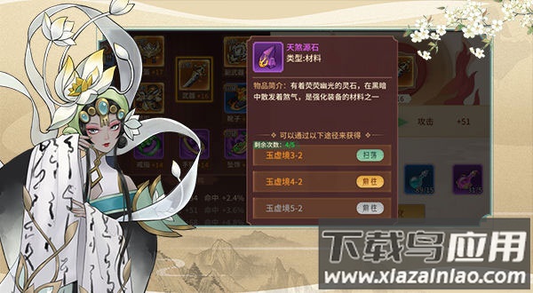 玉虚镜秘境共分为九个章节,每个章节包含六个小关卡。场景从荒古远郊到幽暗兽巢各不相同,主要产出对应等级的装备强化材料。通关不仅能获得大量人物经验,更是获取强化素材的关键途径。