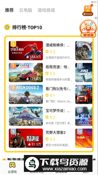 1、启动海鸥云电脑官方应用,点击云游戏可查看热门排行榜单;