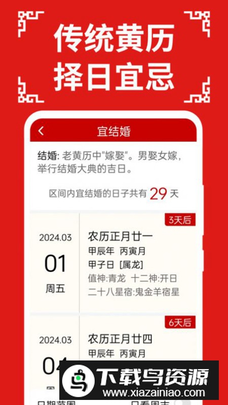 4、黄历查询:每日展示宜忌事项,为用户日常决策与活动安排提供参考;