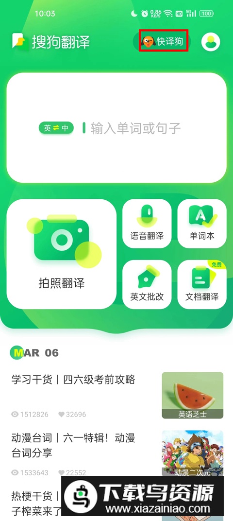 1.下载安装后进入首页,点击右上角“快译狗”入口;