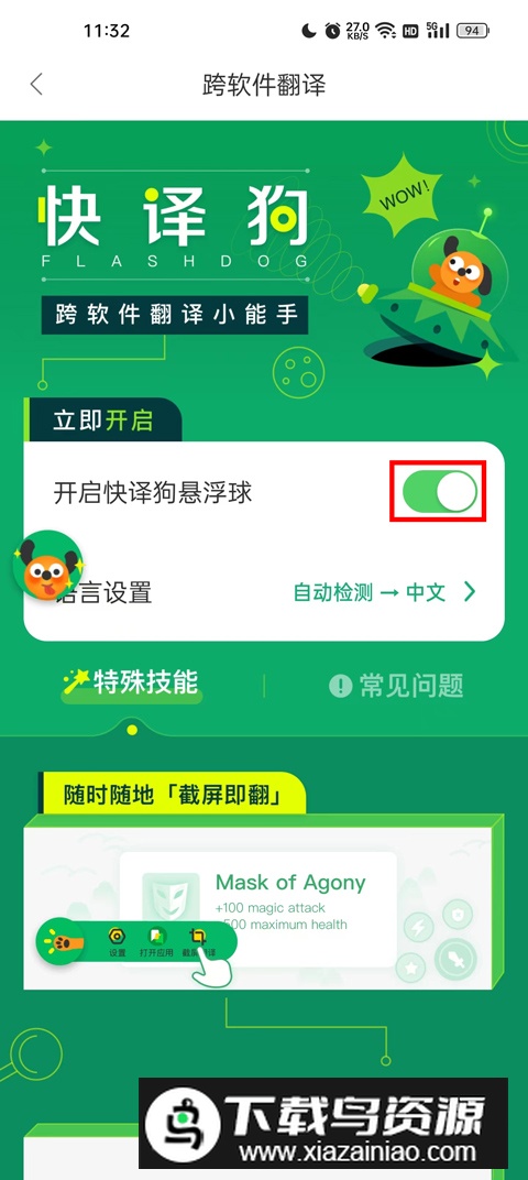 2.在进入的页面中,找到“开启快译狗悬浮球”选项并点击启用;