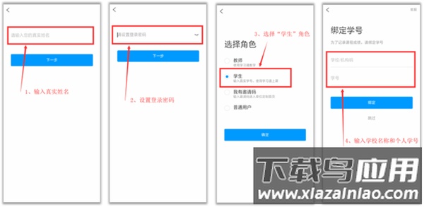 2、绑定单位信息:完成验证后填写真实姓名并设置登录密码;选择个人角色,绑定对应的学号或工号。