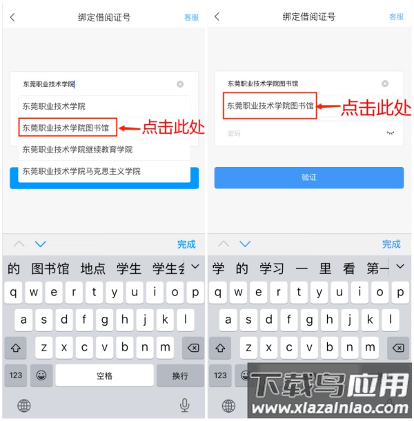 5、输入学校全称并从下拉框中选择“学院图书馆”选项,继续完成绑定操作。