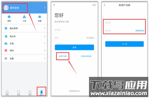 1、注册流程:打开已安装的应用,点击底部“我的”进入个人页面;点击头像进入注册登录界面,选择“新用户注册”选项,输入手机号码并获取验证码。