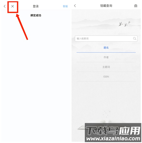 7、绑定成功后点击左上角关闭按钮退出当前窗口;之后即可正常使用“馆藏查询”与“借阅记录”功能。