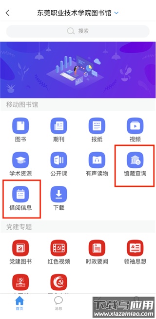 4、进入学校图书馆页面后,点击“馆藏查询”或“借阅记录”进入借阅证绑定界面。