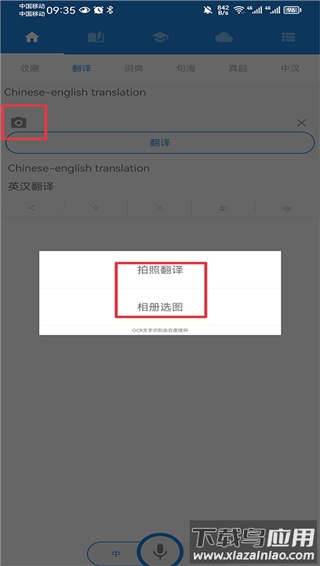 2、点击搜索框旁的相机图标,可选择拍照翻译或从相册选取图片进行识别翻译;