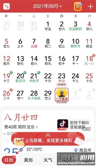 1、日历——下载安装后打开软件,在首页底部切换至日历栏目,即可浏览当月日历内容;