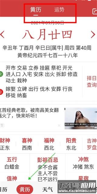 2、黄历——切换到黄历页面,可以查看当天黄历详情与运势提示;