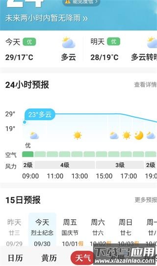3、天气——进入天气页面,可查询当日及未来气象情况,包括24小时与15天天气预报,功能十分实用。