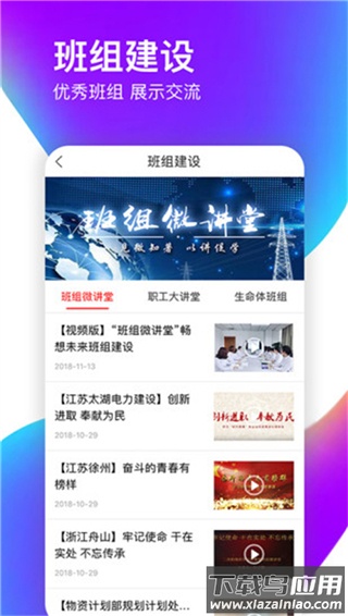 1、应用设有专门的班组建设栏目,展示微讲堂、职工大讲堂及生命体班组等内容。