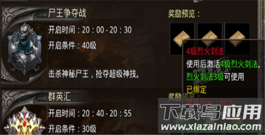 1、开服首周的周一与周三;合服首周的周一、周二、周四及周六;开服首周之后的周一、周二、周四与周五。这些日期的日常活动中会开放“尸王争夺战”,参与竞技即有概率获得技能书,分解后即可取得技能书页。