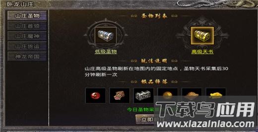 在山庄的“山庄圣物”处可搜集散落在地图各位置的天书,低级天书随机刷新,高级天书则固定于地图五个地点出现;搜集后显示刷新时间,时间结束后可再次获取。收集高级天书有机会得到五张技能书页,每位玩家每日可收集两次高级天书。