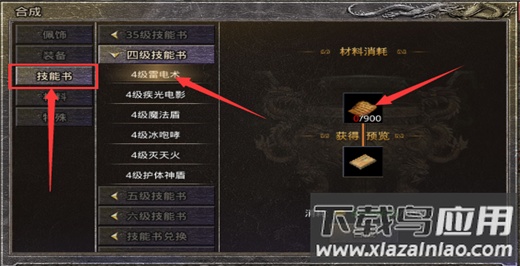 在合成界面中可以看到,将低级技能升级为高级技能时,技能书页是主要消耗材料;例如把3级技能【雷电术】提升至4级,需要消耗900张技能书页。