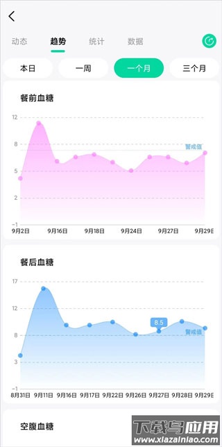 每个测量值都具有参考意义。应用会将每日、每周、每月及三个月的血糖数据绘制成趋势图表,并计算模拟糖化血红蛋白值与平均值。图表中会分别显示空腹、餐前与餐后血糖的整体走向,让你清晰看到各阶段的波动情况。