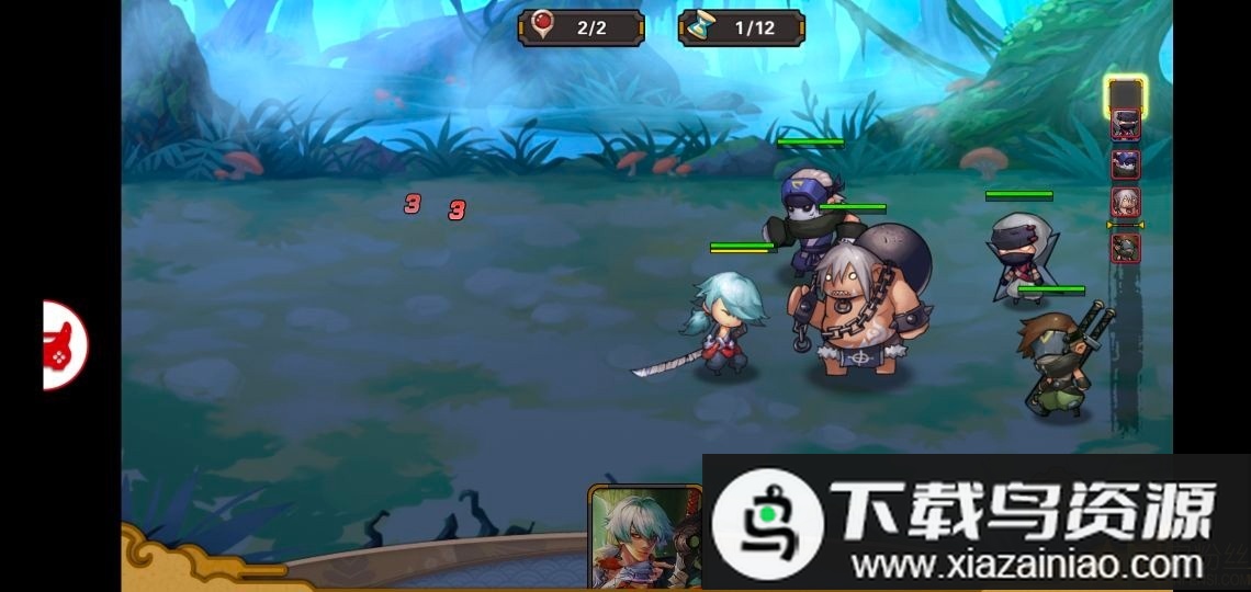 1、游戏采用Q萌讨喜的画风,战斗以回合制进行,玩家需依据手中忍者进行阵容编排;