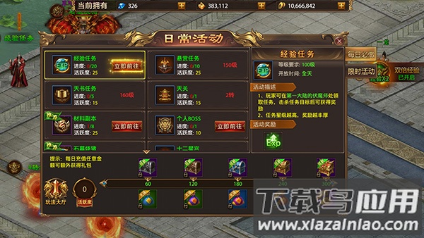 2、紧跟主线与日常任务快速升级,参与各类任务与首领挑战继续提升等级;