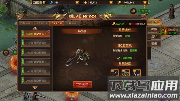 4、通过个人首领战获取前期装备,随等级提高挑战更强大首领,实现装备持续更新;