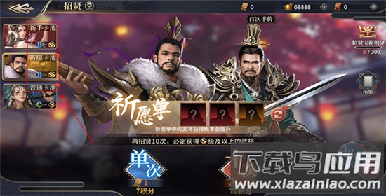 3.玩家通过招贤获取武将,招贤分为新手、祈愿、普通三类,达到指定次数后必定获得稀有武将;