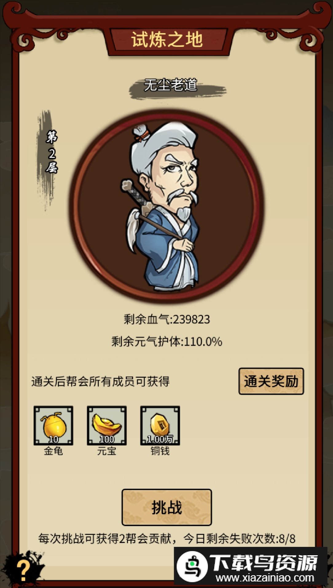 4. 试炼之地:帮会成员共同挑战宗师,协力击破其元气护体。每通过一关,全帮成员均可领取通关奖励。帮会等级每提升1级,关卡上限增加50关,总计500关等待挑战。累计奖励包括5000金龟与5万元宝。