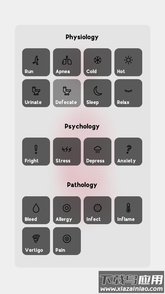 10、点击右下角人体图标,可为模型设置不同状态,包括生理、心理与病理三类,观察人体在各种条件下的反应。